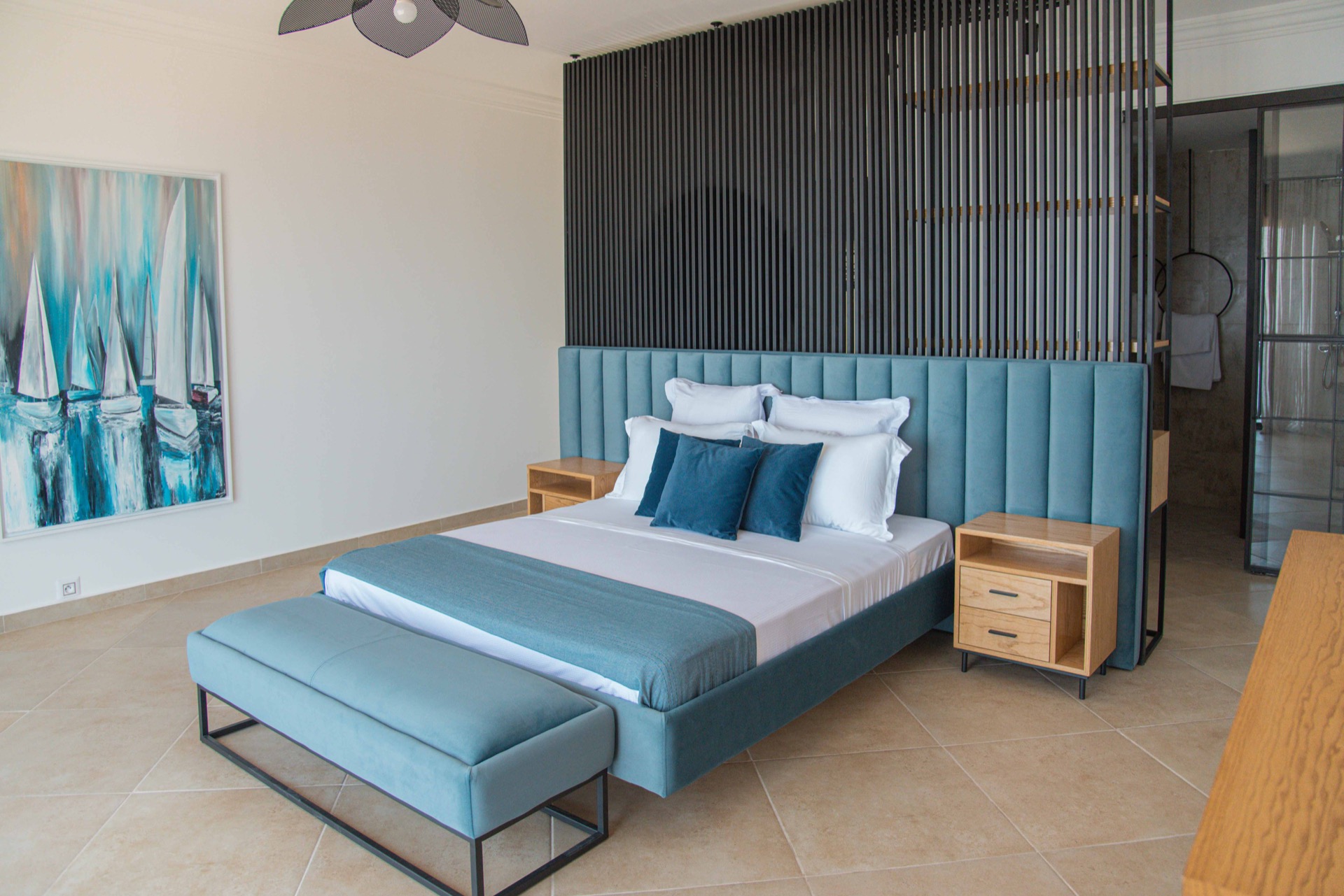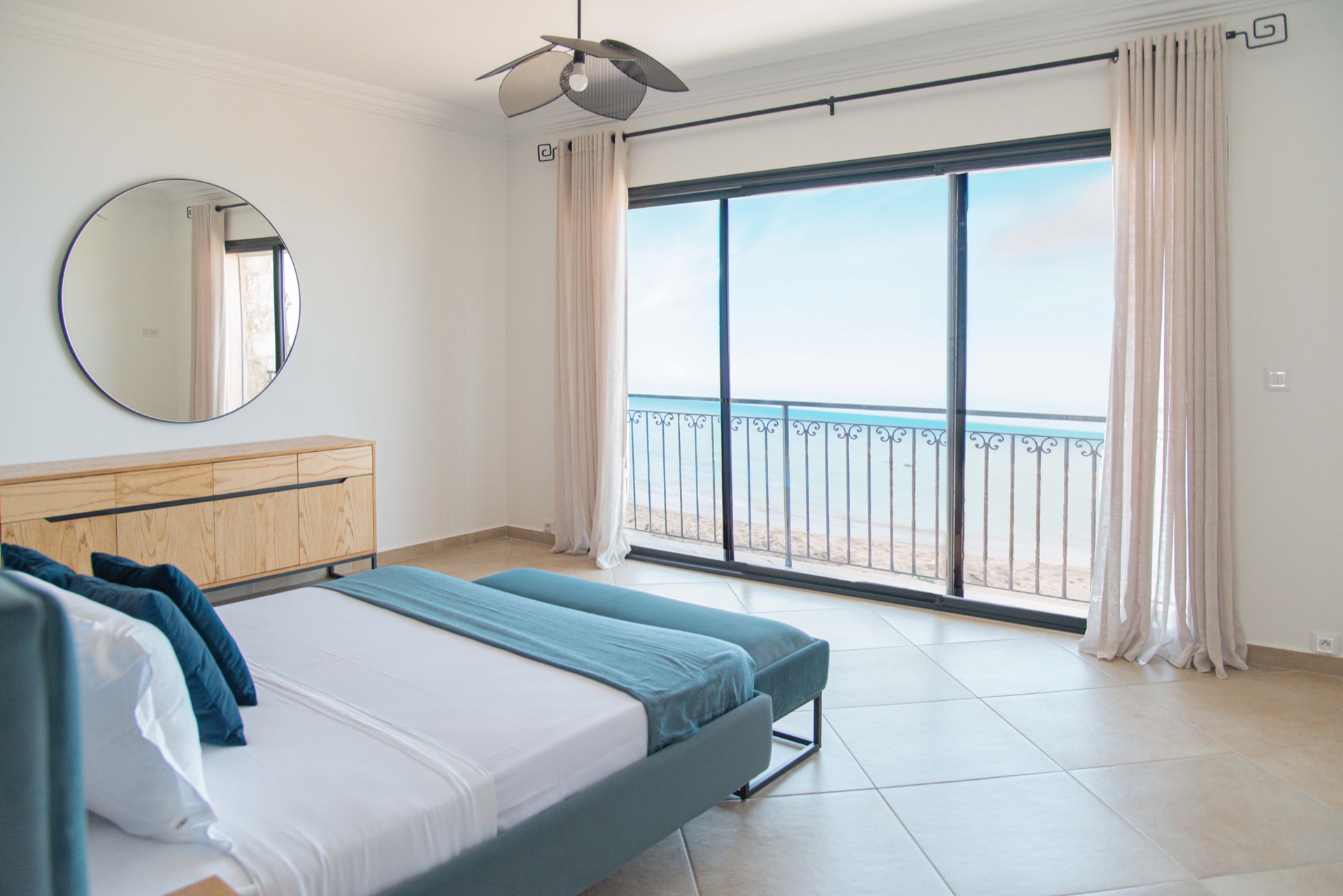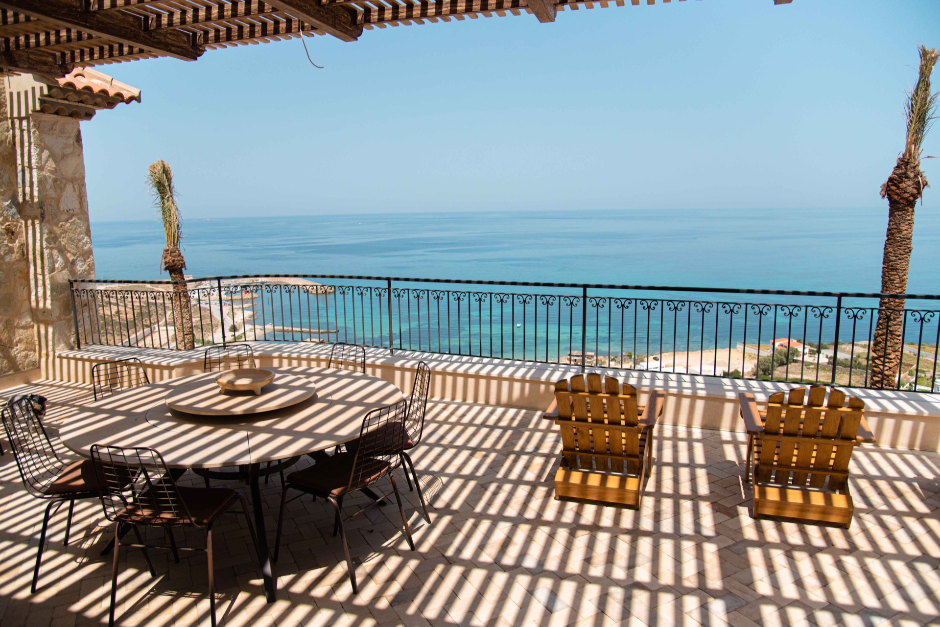 DAR JULIA Cette villa luxueuse allie élégance méditerranéenne et design moderne, offrant des aménagements exceptionnels à l'intérieur comme à l'extérieur. Extérieur À l'extérieur, une piscine à débordement surplombe une vue imprenable sur la mer, entourée de palmiers et de terrasses en pierre naturelle. Cet espace est idéal pour se détendre et profiter de la beauté naturelle environnante. Intérieur À l'intérieur, une cuisine ouverte avec des finitions haut de gamme et un bar en bois massif invite à la convivialité. La salle à manger spacieuse, baignée de lumière naturelle grâce à de grandes baies vitrées, offre une vue magnifique sur l'extérieur. Salon Dans l'espace ouvert de la maison, le salon est un havre de confort et de style. Aménagé avec des meubles modernes et élégants, il est idéal pour se détendre ou recevoir des invités. Les grandes fenêtres et les portes vitrées laissent entrer une abondante lumière naturelle et offrent des vues imprenables sur la piscine et la mer. Suites Les suites de la villa sont de véritables oasis de confort et de tranquillité, offrant chacune une vue spectaculaire sur la mer. Décorées avec goût, elles allient des matériaux naturels et des touches modernes. Les grandes fenêtres panoramiques laissent entrer une abondante lumière naturelle et offrent des vues imprenables sur les paysages environnants. Les suites disposent de lits doubles de salles de bains attenantes luxueuses avec des douches à l'italienne. Des espaces de rangement généreux et des touches de décoration élégantes complètent ces havres de paix, assurant un séjour des plus confortables. Hammam Pour une détente ultime, la villa comprend également un hammam privé. Cet espace de bien-être, décoré dans un style traditionnel avec des mosaïques et des matériaux naturels, offre un lieu parfait pour se relaxer et se revitaliser après une journée au soleil.